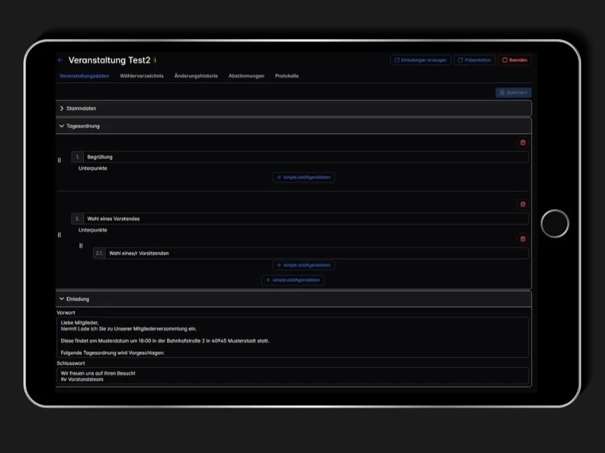 Die Veranstaltungsübersicht stellt die Stammdaten der Veranstaltung übersichtlich dar. Nach dem Erstellen der Tagesordnung und der Angabe weiterer Daten kann die Einladung zur Veranstaltung verschickt werden.